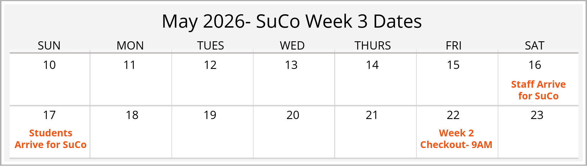Arrival and Departure Dates for SuCo Week 3